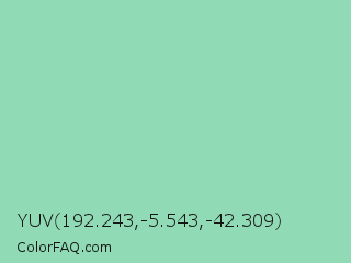 YUV 192.243,-5.543,-42.309 Color is a light green color and the nearest color is Vista Blue #8fd6b4. Hex code #90dbb5 and RGB value is rgb(144,219,181). In RGB color space, this color is composed of 56% red, 86% green, 71% blue, In CMYK color space, this color is composed of 34% cyan, 0% magenta, 17% yellow , 14% black , In HSL color space, this color has a hue angle of 150° , 51% saturation and 71% lightness.