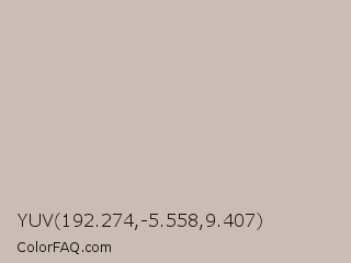 YUV 192.274,-5.558,9.407 Color is a light orange color and the nearest color is Cold Turkey #cebaba. Hex code #cbbdb5 and RGB value is rgb(203,189,181). In RGB color space, this color is composed of 80% red, 74% green, 71% blue, In CMYK color space, this color is composed of 0% cyan, 7% magenta, 11% yellow , 20% black , In HSL color space, this color has a hue angle of 22° , 17% saturation and 75% lightness.