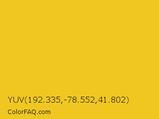 YUV 192.335,-78.552,41.802 Color is a normal yellow color and the nearest color is Deep Lemon #f5c71a. Hex code #f0c721 and RGB value is rgb(240,199,33). In RGB color space, this color is composed of 94% red, 78% green, 13% blue, In CMYK color space, this color is composed of 0% cyan, 17% magenta, 86% yellow , 6% black , In HSL color space, this color has a hue angle of 48° , 87% saturation and 54% lightness.