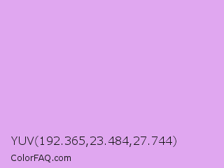 YUV 192.365,23.484,27.744 Color is a light purple color and the nearest color is Mauve #e0b0ff. Hex code #e0a7f0 and RGB value is rgb(224,167,240). In RGB color space, this color is composed of 88% red, 65% green, 94% blue, In CMYK color space, this color is composed of 7% cyan, 30% magenta, 0% yellow , 6% black , In HSL color space, this color has a hue angle of 287° , 71% saturation and 80% lightness.