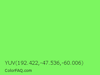 YUV 192.422,-47.536,-60.006 Color is a light green color and the nearest color is Screamin Green #66ff66. Hex code #7cf660 and RGB value is rgb(124,246,96). In RGB color space, this color is composed of 49% red, 96% green, 38% blue, In CMYK color space, this color is composed of 50% cyan, 0% magenta, 61% yellow , 4% black , In HSL color space, this color has a hue angle of 109° , 89% saturation and 67% lightness.