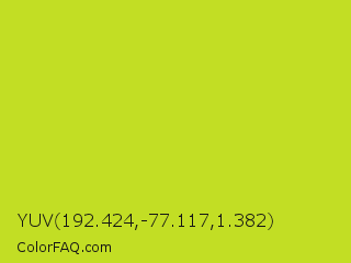 YUV 192.424,-77.117,1.382 Color is a normal yellow color and the nearest color is Pear #d1e231. Hex code #c2de24 and RGB value is rgb(194,222,36). In RGB color space, this color is composed of 76% red, 87% green, 14% blue, In CMYK color space, this color is composed of 13% cyan, 0% magenta, 84% yellow , 13% black , In HSL color space, this color has a hue angle of 69° , 74% saturation and 51% lightness.