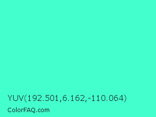 YUV 192.501,6.162,-110.064 Color is a light cyan color and the nearest color is Turquoise #40e0d0. Hex code #43fecd and RGB value is rgb(67,254,205). In RGB color space, this color is composed of 26% red, 100% green, 80% blue, In CMYK color space, this color is composed of 74% cyan, 0% magenta, 19% yellow , 0% black , In HSL color space, this color has a hue angle of 164° , 99% saturation and 63% lightness.