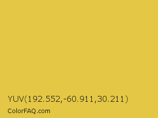 YUV 192.552,-60.911,30.211 Color is a normal yellow color and the nearest color is Ronchi #ecc54e. Hex code #e3c745 and RGB value is rgb(227,199,69). In RGB color space, this color is composed of 89% red, 78% green, 27% blue, In CMYK color space, this color is composed of 0% cyan, 12% magenta, 70% yellow , 11% black , In HSL color space, this color has a hue angle of 49° , 74% saturation and 58% lightness.
