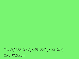 YUV 192.577,-39.231,-63.65 Color is a light green color and the nearest color is Screamin Green #66ff66. Hex code #78f571 and RGB value is rgb(120,245,113). In RGB color space, this color is composed of 47% red, 96% green, 44% blue, In CMYK color space, this color is composed of 51% cyan, 0% magenta, 54% yellow , 4% black , In HSL color space, this color has a hue angle of 117° , 87% saturation and 70% lightness.