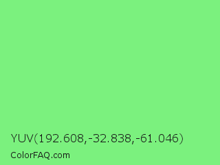 YUV 192.608,-32.838,-61.046 Color is a light green color and the nearest color is Pastel Green #77dd77. Hex code #7bf17e and RGB value is rgb(123,241,126). In RGB color space, this color is composed of 48% red, 95% green, 49% blue, In CMYK color space, this color is composed of 49% cyan, 0% magenta, 48% yellow , 5% black , In HSL color space, this color has a hue angle of 122° , 81% saturation and 71% lightness.