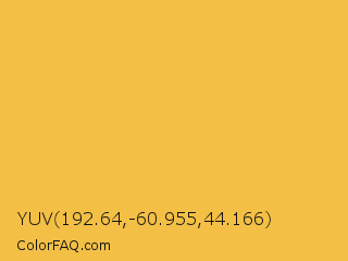 YUV 192.64,-60.955,44.166 Color is a light orange color and the nearest color is Maximum Yellow Red #f2ba49. Hex code #f3bf45 and RGB value is rgb(243,191,69). In RGB color space, this color is composed of 95% red, 75% green, 27% blue, In CMYK color space, this color is composed of 0% cyan, 21% magenta, 72% yellow , 5% black , In HSL color space, this color has a hue angle of 42° , 88% saturation and 61% lightness.