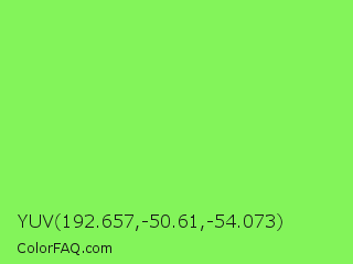 YUV 192.657,-50.61,-54.073 Color is a light green color and the nearest color is Kiwi #8ee53f. Hex code #83f45a and RGB value is rgb(131,244,90). In RGB color space, this color is composed of 51% red, 96% green, 35% blue, In CMYK color space, this color is composed of 46% cyan, 0% magenta, 63% yellow , 4% black , In HSL color space, this color has a hue angle of 104° , 88% saturation and 65% lightness.