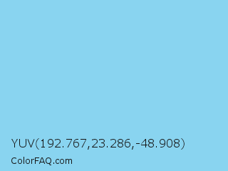 YUV 192.767,23.286,-48.908 Color is a light blue color and the nearest color is Baby Blue #89cff0. Hex code #89d4f0 and RGB value is rgb(137,212,240). In RGB color space, this color is composed of 54% red, 83% green, 94% blue, In CMYK color space, this color is composed of 43% cyan, 12% magenta, 0% yellow , 6% black , In HSL color space, this color has a hue angle of 196° , 77% saturation and 74% lightness.