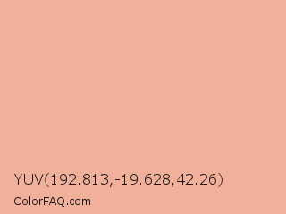 YUV 192.813,-19.628,42.26 Color is a light orange color and the nearest color is Rose Bud #fbb2a3. Hex code #f1b099 and RGB value is rgb(241,176,153). In RGB color space, this color is composed of 95% red, 69% green, 60% blue, In CMYK color space, this color is composed of 0% cyan, 27% magenta, 37% yellow , 5% black , In HSL color space, this color has a hue angle of 16° , 76% saturation and 77% lightness.
