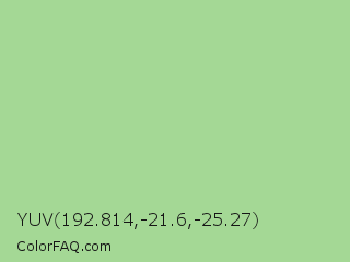 YUV 192.814,-21.6,-25.27 Color is a light green color and the nearest color is Granny Smith Apple Crayola #9de093. Hex code #a4d895 and RGB value is rgb(164,216,149). In RGB color space, this color is composed of 64% red, 85% green, 58% blue, In CMYK color space, this color is composed of 24% cyan, 0% magenta, 31% yellow , 15% black , In HSL color space, this color has a hue angle of 107° , 46% saturation and 72% lightness.
