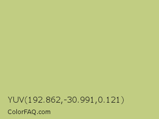 YUV 192.862,-30.991,0.121 Color is a light yellow color and the nearest color is Pine Glade #c7cd90. Hex code #c1cd82 and RGB value is rgb(193,205,130). In RGB color space, this color is composed of 76% red, 80% green, 51% blue, In CMYK color space, this color is composed of 6% cyan, 0% magenta, 37% yellow , 20% black , In HSL color space, this color has a hue angle of 70° , 43% saturation and 66% lightness.