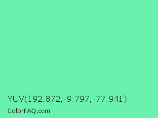 YUV 192.872,-9.797,-77.941 Color is a light green color and the nearest color is Medium Aquamarine #66ddaa. Hex code #68f2ad and RGB value is rgb(104,242,173). In RGB color space, this color is composed of 41% red, 95% green, 68% blue, In CMYK color space, this color is composed of 57% cyan, 0% magenta, 29% yellow , 5% black , In HSL color space, this color has a hue angle of 150° , 84% saturation and 68% lightness.