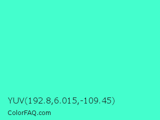 YUV 192.8,6.015,-109.45 Color is a light cyan color and the nearest color is Turquoise #40e0d0. Hex code #44fecd and RGB value is rgb(68,254,205). In RGB color space, this color is composed of 27% red, 100% green, 80% blue, In CMYK color space, this color is composed of 73% cyan, 0% magenta, 19% yellow , 0% black , In HSL color space, this color has a hue angle of 164° , 99% saturation and 63% lightness.