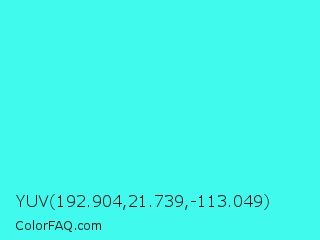 YUV 192.904,21.739,-113.049 Color is a light cyan color and the nearest color is Turquoise #40e0d0. Hex code #40faed and RGB value is rgb(64,250,237). In RGB color space, this color is composed of 25% red, 98% green, 93% blue, In CMYK color space, this color is composed of 74% cyan, 0% magenta, 5% yellow , 2% black , In HSL color space, this color has a hue angle of 176° , 95% saturation and 62% lightness.