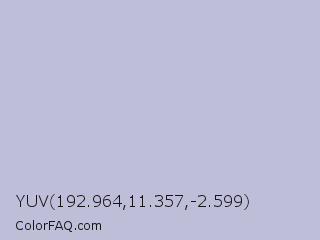 YUV 192.964,11.357,-2.599 Color is a light blue color and the nearest color is Blue Haze #bfbed8. Hex code #bebed8 and RGB value is rgb(190,190,216). In RGB color space, this color is composed of 75% red, 75% green, 85% blue, In CMYK color space, this color is composed of 12% cyan, 12% magenta, 0% yellow , 15% black , In HSL color space, this color has a hue angle of 240° , 25% saturation and 80% lightness.