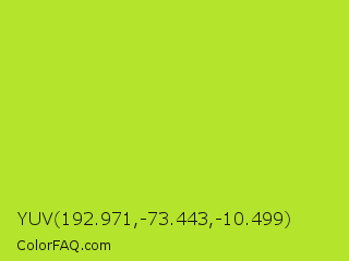 YUV 192.971,-73.443,-10.499 Color is a normal lime color and the nearest color is Green Lizard #a7f432. Hex code #b5e42c and RGB value is rgb(181,228,44). In RGB color space, this color is composed of 71% red, 89% green, 17% blue, In CMYK color space, this color is composed of 21% cyan, 0% magenta, 81% yellow , 11% black , In HSL color space, this color has a hue angle of 75° , 77% saturation and 53% lightness.