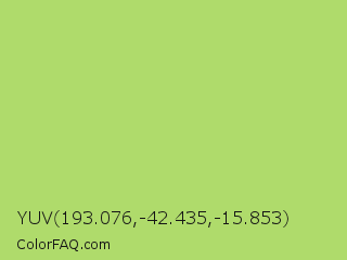 YUV 193.076,-42.435,-15.853 Color is a light green color and the nearest color is Inchworm #b2ec5d. Hex code #afdb6b and RGB value is rgb(175,219,107). In RGB color space, this color is composed of 69% red, 86% green, 42% blue, In CMYK color space, this color is composed of 20% cyan, 0% magenta, 51% yellow , 14% black , In HSL color space, this color has a hue angle of 84° , 61% saturation and 64% lightness.
