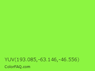 YUV 193.085,-63.146,-46.556 Color is a light green color and the nearest color is Kiwi #8ee53f. Hex code #8cf541 and RGB value is rgb(140,245,65). In RGB color space, this color is composed of 55% red, 96% green, 25% blue, In CMYK color space, this color is composed of 43% cyan, 0% magenta, 73% yellow , 4% black , In HSL color space, this color has a hue angle of 95° , 90% saturation and 61% lightness.