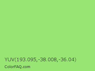 YUV 193.095,-38.008,-36.04 Color is a light green color and the nearest color is Feijoa #9fdd8c. Hex code #98e574 and RGB value is rgb(152,229,116). In RGB color space, this color is composed of 60% red, 90% green, 45% blue, In CMYK color space, this color is composed of 34% cyan, 0% magenta, 49% yellow , 10% black , In HSL color space, this color has a hue angle of 101° , 68% saturation and 68% lightness.