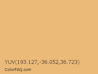 YUV 193.127,-36.052,36.723 Color is a light orange color and the nearest color is Middle Yellow Red #ecb176. Hex code #ebba78 and RGB value is rgb(235,186,120). In RGB color space, this color is composed of 92% red, 73% green, 47% blue, In CMYK color space, this color is composed of 0% cyan, 21% magenta, 49% yellow , 8% black , In HSL color space, this color has a hue angle of 34° , 74% saturation and 70% lightness.