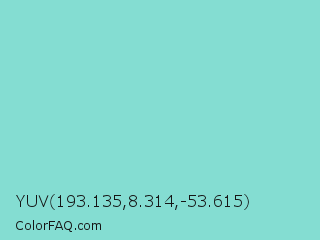 YUV 193.135,8.314,-53.615 Color is a light cyan color and the nearest color is Middle Blue Green #8dd9cc. Hex code #84ddd2 and RGB value is rgb(132,221,210). In RGB color space, this color is composed of 52% red, 87% green, 82% blue, In CMYK color space, this color is composed of 40% cyan, 0% magenta, 5% yellow , 13% black , In HSL color space, this color has a hue angle of 173° , 57% saturation and 69% lightness.