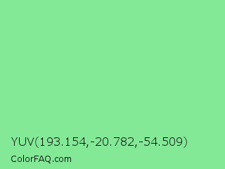 YUV 193.154,-20.782,-54.509 Color is a light green color and the nearest color is Light Green #90ee90. Hex code #83e997 and RGB value is rgb(131,233,151). In RGB color space, this color is composed of 51% red, 91% green, 59% blue, In CMYK color space, this color is composed of 44% cyan, 0% magenta, 35% yellow , 9% black , In HSL color space, this color has a hue angle of 132° , 70% saturation and 71% lightness.