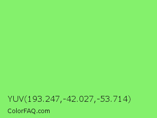 YUV 193.247,-42.027,-53.714 Color is a light green color and the nearest color is Pastel Green #77dd77. Hex code #84f16c and RGB value is rgb(132,241,108). In RGB color space, this color is composed of 52% red, 95% green, 42% blue, In CMYK color space, this color is composed of 45% cyan, 0% magenta, 55% yellow , 5% black , In HSL color space, this color has a hue angle of 109° , 83% saturation and 68% lightness.