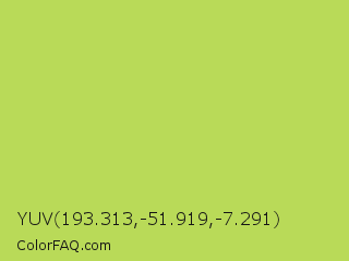 YUV 193.313,-51.919,-7.291 Color is a normal lime color and the nearest color is June Bud #bdda57. Hex code #b9da58 and RGB value is rgb(185,218,88). In RGB color space, this color is composed of 73% red, 85% green, 35% blue, In CMYK color space, this color is composed of 15% cyan, 0% magenta, 60% yellow , 15% black , In HSL color space, this color has a hue angle of 75° , 64% saturation and 60% lightness.