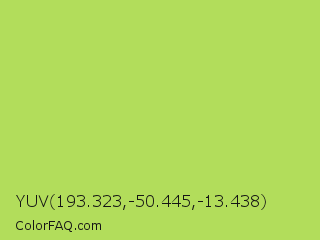 YUV 193.323,-50.445,-13.438 Color is a light green color and the nearest color is June Bud #bdda57. Hex code #b2dd5b and RGB value is rgb(178,221,91). In RGB color space, this color is composed of 70% red, 87% green, 36% blue, In CMYK color space, this color is composed of 19% cyan, 0% magenta, 59% yellow , 13% black , In HSL color space, this color has a hue angle of 80° , 66% saturation and 61% lightness.