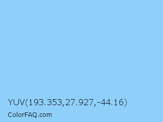 YUV 193.353,27.927,-44.16 Color is a light blue color and the nearest color is Light Sky Blue #87cefa. Hex code #8fd0fa and RGB value is rgb(143,208,250). In RGB color space, this color is composed of 56% red, 82% green, 98% blue, In CMYK color space, this color is composed of 43% cyan, 17% magenta, 0% yellow , 2% black , In HSL color space, this color has a hue angle of 204° , 91% saturation and 77% lightness.