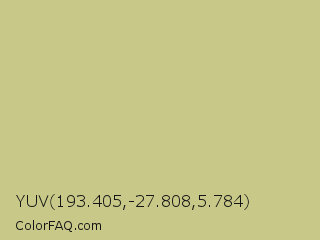 YUV 193.405,-27.808,5.784 Color is a light yellow color and the nearest color is Pine Glade #c7cd90. Hex code #c8c989 and RGB value is rgb(200,201,137). In RGB color space, this color is composed of 78% red, 79% green, 54% blue, In CMYK color space, this color is composed of 0% cyan, 0% magenta, 32% yellow , 21% black , In HSL color space, this color has a hue angle of 61° , 37% saturation and 66% lightness.