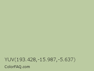 YUV 193.428,-15.987,-5.637 Color is a light green color and the nearest color is Rainee #b9c8ac. Hex code #bbcba1 and RGB value is rgb(187,203,161). In RGB color space, this color is composed of 73% red, 80% green, 63% blue, In CMYK color space, this color is composed of 8% cyan, 0% magenta, 21% yellow , 20% black , In HSL color space, this color has a hue angle of 83° , 29% saturation and 71% lightness.