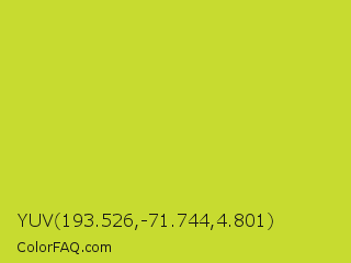 YUV 193.526,-71.744,4.801 Color is a normal yellow color and the nearest color is Pear #d1e231. Hex code #c7db30 and RGB value is rgb(199,219,48). In RGB color space, this color is composed of 78% red, 86% green, 19% blue, In CMYK color space, this color is composed of 9% cyan, 0% magenta, 78% yellow , 14% black , In HSL color space, this color has a hue angle of 67° , 70% saturation and 52% lightness.
