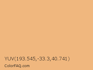YUV 193.545,-33.3,40.741 Color is a light orange color and the nearest color is Tacao #edb381. Hex code #f0b77e and RGB value is rgb(240,183,126). In RGB color space, this color is composed of 94% red, 72% green, 49% blue, In CMYK color space, this color is composed of 0% cyan, 24% magenta, 48% yellow , 6% black , In HSL color space, this color has a hue angle of 30° , 79% saturation and 72% lightness.