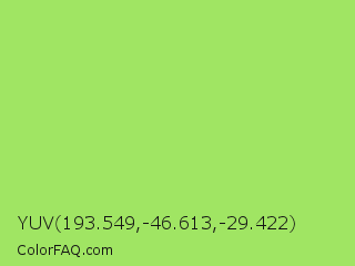 YUV 193.549,-46.613,-29.422 Color is a light green color and the nearest color is Inchworm #b2ec5d. Hex code #a0e563 and RGB value is rgb(160,229,99). In RGB color space, this color is composed of 63% red, 90% green, 39% blue, In CMYK color space, this color is composed of 30% cyan, 0% magenta, 57% yellow , 10% black , In HSL color space, this color has a hue angle of 92° , 71% saturation and 64% lightness.