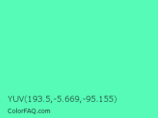 YUV 193.5,-5.669,-95.155 Color is a light green color and the nearest color is Medium Aquamarine #66ddaa. Hex code #55fbb6 and RGB value is rgb(85,251,182). In RGB color space, this color is composed of 33% red, 98% green, 71% blue, In CMYK color space, this color is composed of 66% cyan, 0% magenta, 27% yellow , 2% black , In HSL color space, this color has a hue angle of 155° , 95% saturation and 66% lightness.