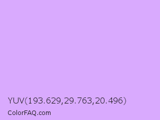 YUV 193.629,29.763,20.496 Color is a very light purple color and the nearest color is Mauve #e0b0ff. Hex code #d9aafe and RGB value is rgb(217,170,254). In RGB color space, this color is composed of 85% red, 67% green, 100% blue, In CMYK color space, this color is composed of 15% cyan, 33% magenta, 0% yellow , 0% black , In HSL color space, this color has a hue angle of 274° , 98% saturation and 83% lightness.