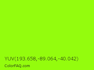 YUV 193.658,-89.064,-40.042 Color is a normal green color and the nearest color is Spring Bud #a7fc00. Hex code #94fc0d and RGB value is rgb(148,252,13). In RGB color space, this color is composed of 58% red, 99% green, 5% blue, In CMYK color space, this color is composed of 41% cyan, 0% magenta, 95% yellow , 1% black , In HSL color space, this color has a hue angle of 86° , 98% saturation and 52% lightness.