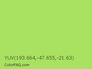 YUV 193.664,-47.655,-21.63 Color is a light green color and the nearest color is Inchworm #b2ec5d. Hex code #a9e161 and RGB value is rgb(169,225,97). In RGB color space, this color is composed of 66% red, 88% green, 38% blue, In CMYK color space, this color is composed of 25% cyan, 0% magenta, 57% yellow , 12% black , In HSL color space, this color has a hue angle of 86° , 68% saturation and 63% lightness.