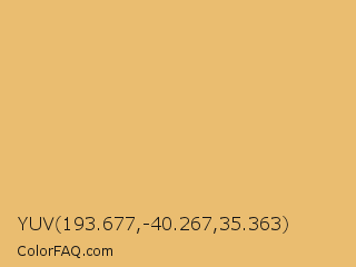 YUV 193.677,-40.267,35.363 Color is a light orange color and the nearest color is Rob Roy #eac674. Hex code #eabd70 and RGB value is rgb(234,189,112). In RGB color space, this color is composed of 92% red, 74% green, 44% blue, In CMYK color space, this color is composed of 0% cyan, 19% magenta, 52% yellow , 8% black , In HSL color space, this color has a hue angle of 38° , 74% saturation and 68% lightness.