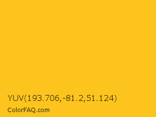 YUV 193.706,-81.2,51.124 Color is a normal orange color and the nearest color is Lightning Yellow #fcc01e. Hex code #fcc41d and RGB value is rgb(252,196,29). In RGB color space, this color is composed of 99% red, 77% green, 11% blue, In CMYK color space, this color is composed of 0% cyan, 22% magenta, 88% yellow , 1% black , In HSL color space, this color has a hue angle of 45° , 97% saturation and 55% lightness.