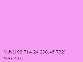 YUV 193.714,24.298,46.732 Color is a light magenta color and the nearest color is Rich Brilliant Lavender #f1a7fe. Hex code #f79df3 and RGB value is rgb(247,157,243). In RGB color space, this color is composed of 97% red, 62% green, 95% blue, In CMYK color space, this color is composed of 0% cyan, 36% magenta, 2% yellow , 3% black , In HSL color space, this color has a hue angle of 303° , 85% saturation and 79% lightness.