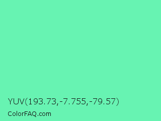 YUV 193.73,-7.755,-79.57 Color is a light green color and the nearest color is Medium Aquamarine #66ddaa. Hex code #67f3b2 and RGB value is rgb(103,243,178). In RGB color space, this color is composed of 40% red, 95% green, 70% blue, In CMYK color space, this color is composed of 58% cyan, 0% magenta, 27% yellow , 5% black , In HSL color space, this color has a hue angle of 152° , 85% saturation and 68% lightness.