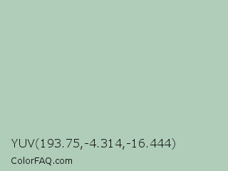 YUV 193.75,-4.314,-16.444 Color is a light green color and the nearest color is Spring Rain #accbb1. Hex code #afcdb9 and RGB value is rgb(175,205,185). In RGB color space, this color is composed of 69% red, 80% green, 73% blue, In CMYK color space, this color is composed of 15% cyan, 0% magenta, 10% yellow , 20% black , In HSL color space, this color has a hue angle of 140° , 23% saturation and 75% lightness.