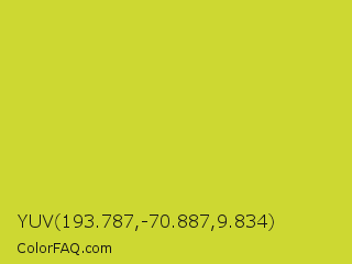 YUV 193.787,-70.887,9.834 Color is a normal yellow color and the nearest color is Pear #d1e231. Hex code #cdd832 and RGB value is rgb(205,216,50). In RGB color space, this color is composed of 80% red, 85% green, 20% blue, In CMYK color space, this color is composed of 5% cyan, 0% magenta, 77% yellow , 15% black , In HSL color space, this color has a hue angle of 64° , 68% saturation and 52% lightness.