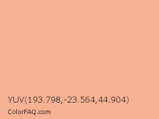 YUV 193.798,-23.564,44.904 Color is a light orange color and the nearest color is Rose Bud #fbb2a3. Hex code #f5b192 and RGB value is rgb(245,177,146). In RGB color space, this color is composed of 96% red, 69% green, 57% blue, In CMYK color space, this color is composed of 0% cyan, 28% magenta, 40% yellow , 4% black , In HSL color space, this color has a hue angle of 19° , 83% saturation and 77% lightness.