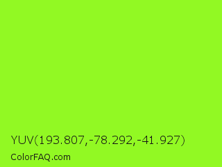 YUV 193.807,-78.292,-41.927 Color is a normal green color and the nearest color is Spring Frost #87ff2a. Hex code #92f923 and RGB value is rgb(146,249,35). In RGB color space, this color is composed of 57% red, 98% green, 14% blue, In CMYK color space, this color is composed of 41% cyan, 0% magenta, 86% yellow , 2% black , In HSL color space, this color has a hue angle of 89° , 95% saturation and 56% lightness.