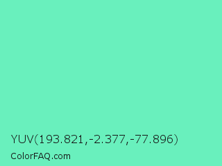 YUV 193.821,-2.377,-77.896 Color is a light green color and the nearest color is Medium Aquamarine #66ddaa. Hex code #69f0bd and RGB value is rgb(105,240,189). In RGB color space, this color is composed of 41% red, 94% green, 74% blue, In CMYK color space, this color is composed of 56% cyan, 0% magenta, 21% yellow , 6% black , In HSL color space, this color has a hue angle of 157° , 82% saturation and 68% lightness.