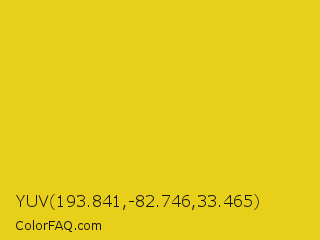 YUV 193.841,-82.746,33.465 Color is a normal yellow color and the nearest color is Sunflower #e4d422. Hex code #e8cf1a and RGB value is rgb(232,207,26). In RGB color space, this color is composed of 91% red, 81% green, 10% blue, In CMYK color space, this color is composed of 0% cyan, 11% magenta, 89% yellow , 9% black , In HSL color space, this color has a hue angle of 53° , 82% saturation and 51% lightness.